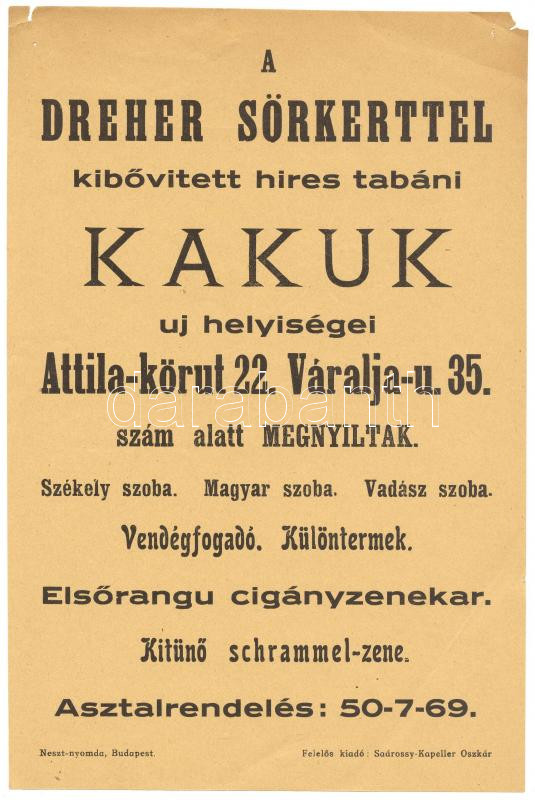 cca 1930 Budapest I. Tabáni Kakukk étterem Dreher reklámplakát 17x25 c... https://www.darabanth.com/de/174-Fernauktion/174.0/Andere-Sammelgebiete/Drucksachen~2200040/cca-1930-Budapest-I-Tabani-Kakukk-etterem-Dreher-reklamplakat-17x25-cm~II596826
