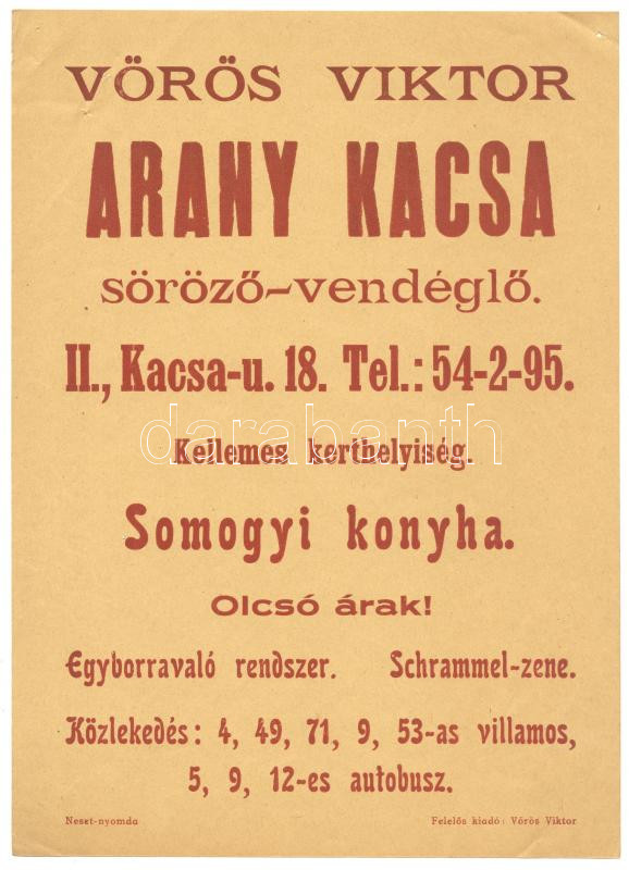 cca 1930 Budapest II. Arany Kacsa étterem söröző reklámplakát 17x25 cm https://www.darabanth.com/de/174-Fernauktion/174.0/Andere-Sammelgebiete/Drucksachen~2200040/cca-1930-Budapest-II-Arany-Kacsa-etterem-sorozo-reklamplakat-17x25-cm~II596828