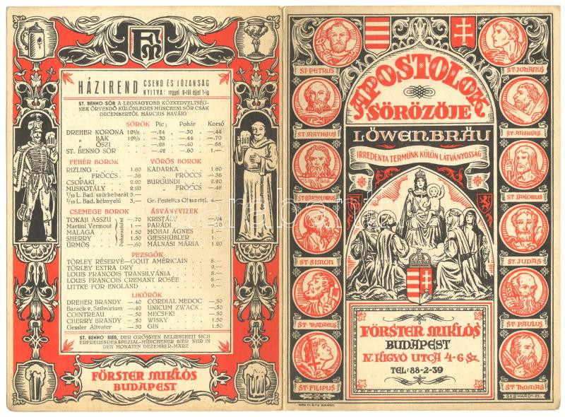 cca 1930 Budapest V. Apostolok söröző dekoratív étlap és házirend 27x... https://www.darabanth.com/de/174-Fernauktion/174.0/Andere-Sammelgebiete/Drucksachen~2200040/cca-1930-Budapest-V-Apostolok-sorozo-dekorativ-etlap-es-hazirend-27x20-cm~II596835