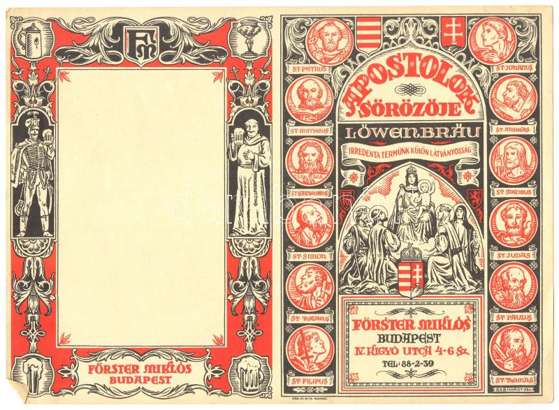 cca 1930 Budapest V. Apostolok söröző dekoratív kitöltetlen reklámos é... https://www.darabanth.com/de/174-Fernauktion/174.0/Andere-Sammelgebiete/Drucksachen~2200040/cca-1930-Budapest-V-Apostolok-sorozo-dekorativ-kitoltetlen-reklamos-etlap-27x20-cm~II596834