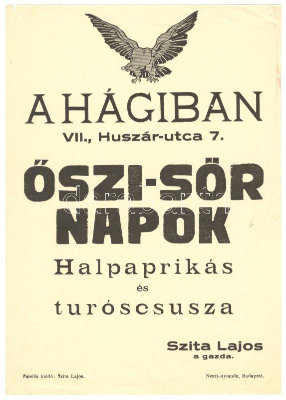 cca 1930 Budapest VII. Hági söröző reklámplakát 17x24 cm https://www.darabanth.com/de/174-Fernauktion/174.0/Andere-Sammelgebiete/Drucksachen~2200040/cca-1930-Budapest-VII-Hagi-sorozo-reklamplakat-17x24-cm~II596833