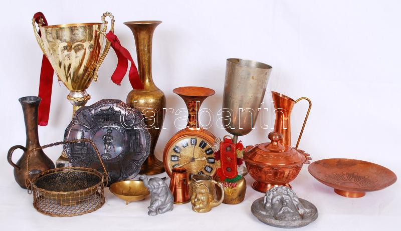 Beschreibung: Egy doboznyi vegyes tétel réz- és egyéb fémtárgyakkal /