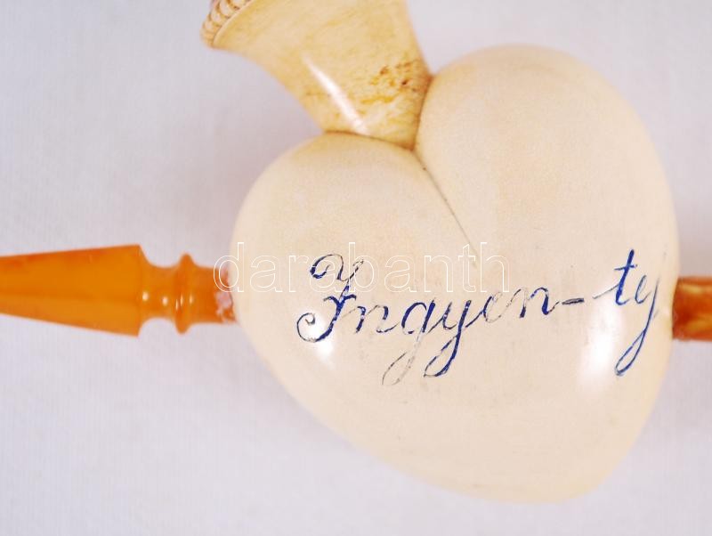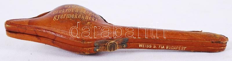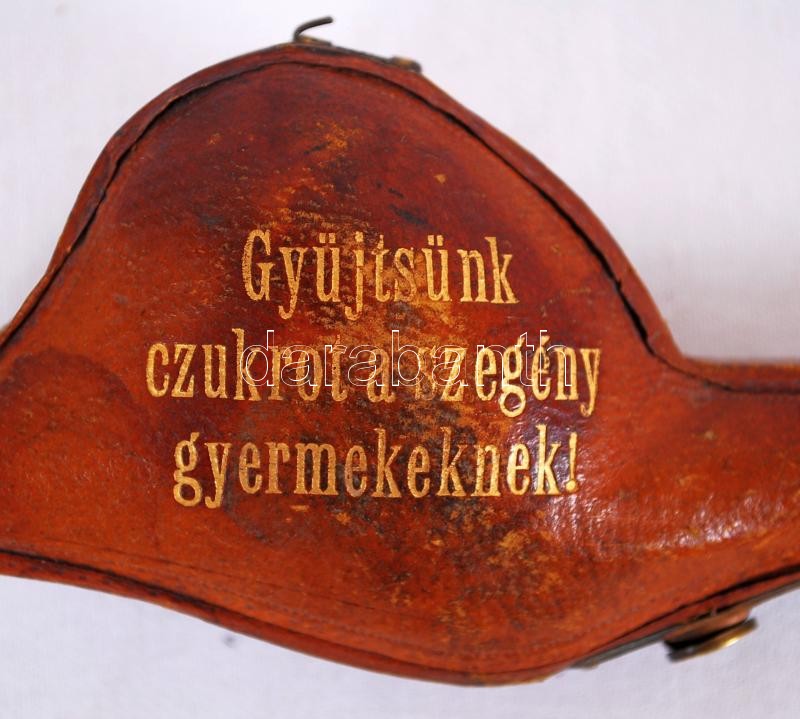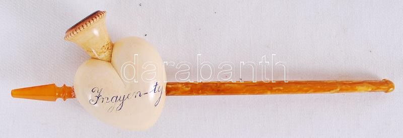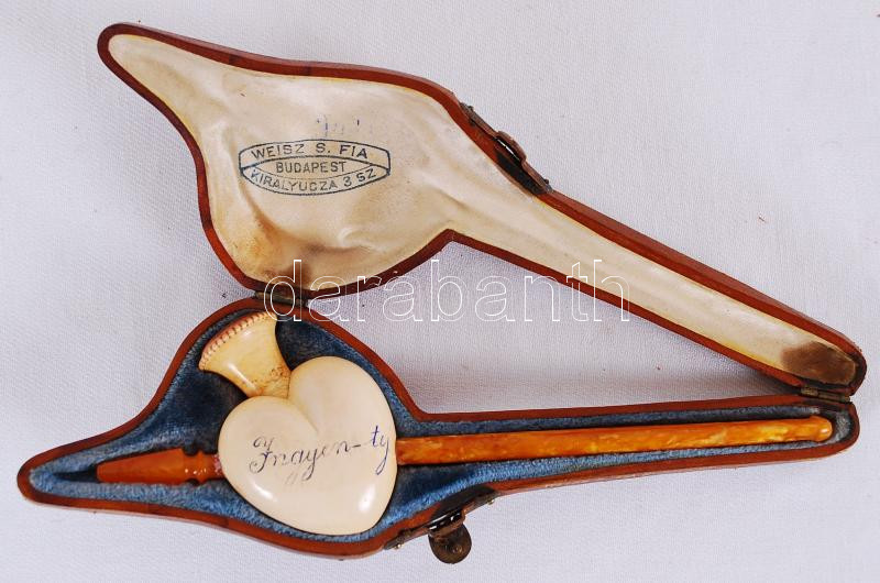cca 1920 Szokatlan alakú női tajtékpipa bakelit szárral Weisz S. Fia Budapest Király u. 3. sz. alatti üzletéből eredeti bőr tokjában, rajta "Gyüjtsünk czukrot a szegény gyermekeknek!" felirattal (a száron kis sérülés és javítás nyoma) /