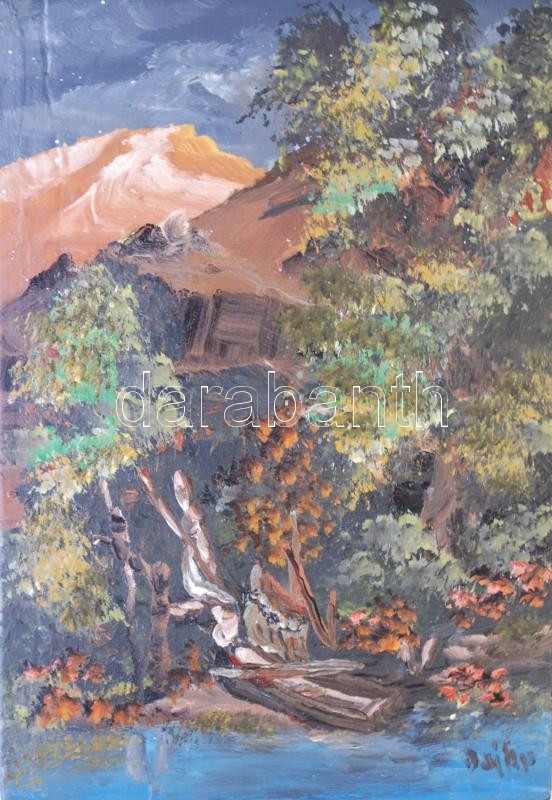 Beschreibung: Dajka jelzéssel: Kopár hegyek, olaj, farost, 22×15 cm