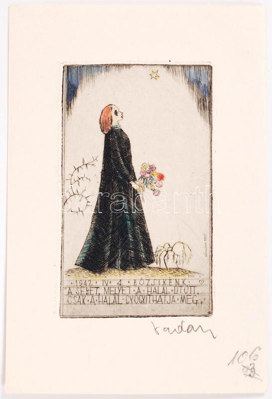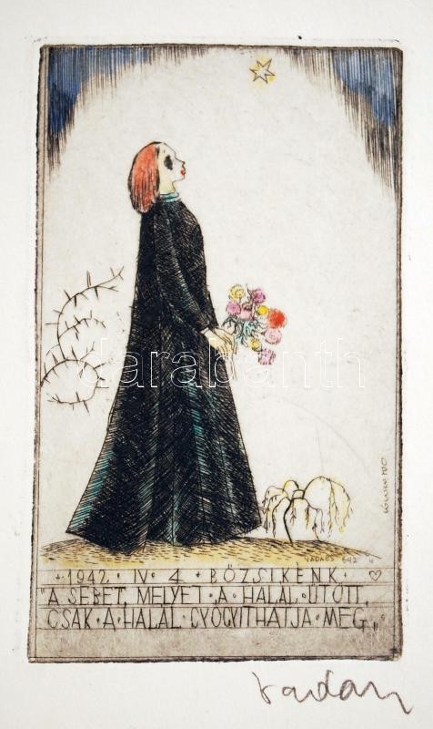 Beschreibung: Vadász Endre (1901-1944): "A sebet, melyet a halál ütött, csak a halál gyógyíthatja meg", gyászkártya, színezett rézmetszet, 9x13,5cm