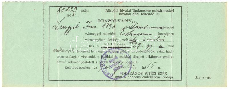 1939 Az Országos Vitézi Szék igazolása Háborús Emlékérem adományozásár... https://www.darabanth.com/de/174-Fernauktion/174.0/Andere-Sammelgebiete/Militaria~2200037/1939-Az-Orszagos-Vitezi-Szek-igazolasa-Haborus-Emlekerem-adomanyozasarol~II598454