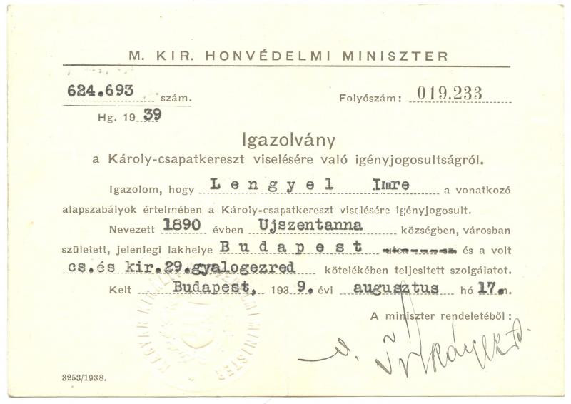 Beschreibung: 1939 Igazolvány Károly-csapatkereszt viselésére való igényjogosultságról