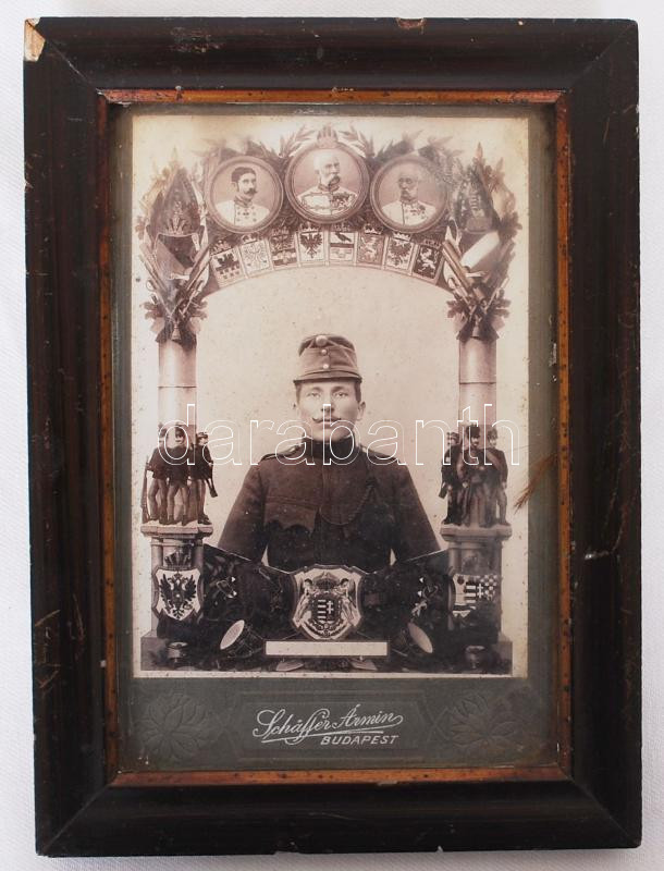 Beschreibung: Cca 1900 díszes katona fotó a monarchia tagországainak címereivé és az uralkodókkal, 20×15 cm üvegezett régi keretben