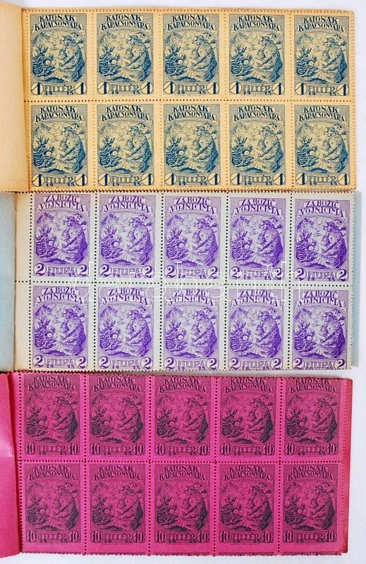 Beschreibung: 1915 Katonák Karácsonyára, komplett 100db-os bélyegfüzetek (3db magyar: 1, 2, 10 f; 2db horvát: 1, 10 f)