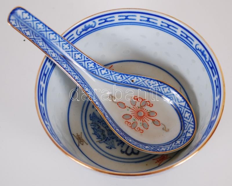 Beschreibung: Kínai kézzel festett csésze evőkanállal, hibátlan, jelzett, d:11 cm