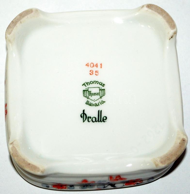 Virágmotívumokkal díszített, aranyozott, jelzett Thomas Bavaria porcelán bonbonniere. Az aranyozás nagyrészt lekopott, a fedelén belül lepattogzás látható /