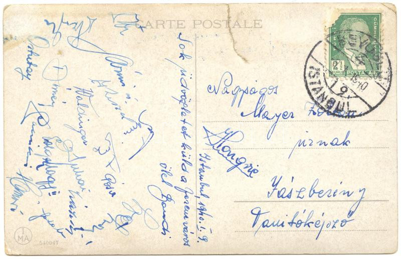 1940 A Ferencvárosi Torna Club labdarúgócsapata tagjai által aláírt képeslap Ortutay, Dimény, Juhari, Waldinger, Hámori és mások aláírásaival az Isztambul elleni 2:2-re végződött meccsről