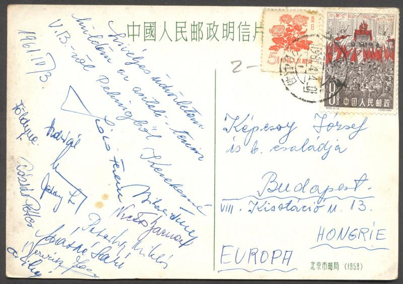 Beschreibung: 1961 A magyar asztalitenisz csapat tagjainak aláírt képeslapja a pekingi VB-ről