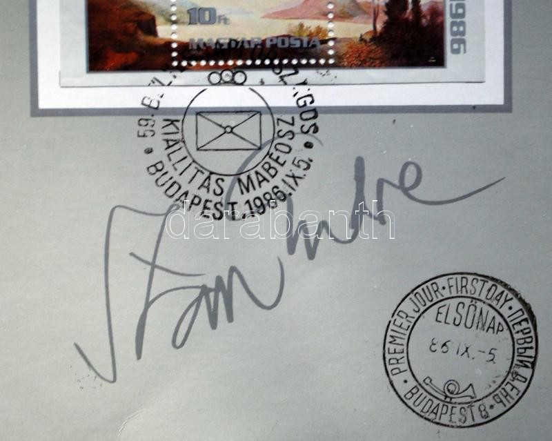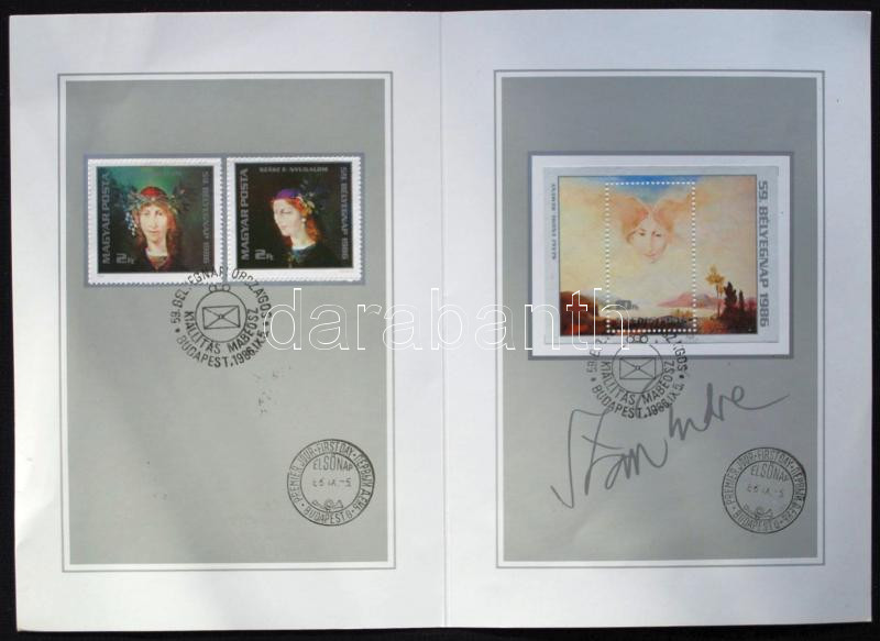 Beschreibung: 1986 Bélyegnap alkalmi bélyegzésű üdvözlőlap a tervező Szász Endre saját kezű aláírásával