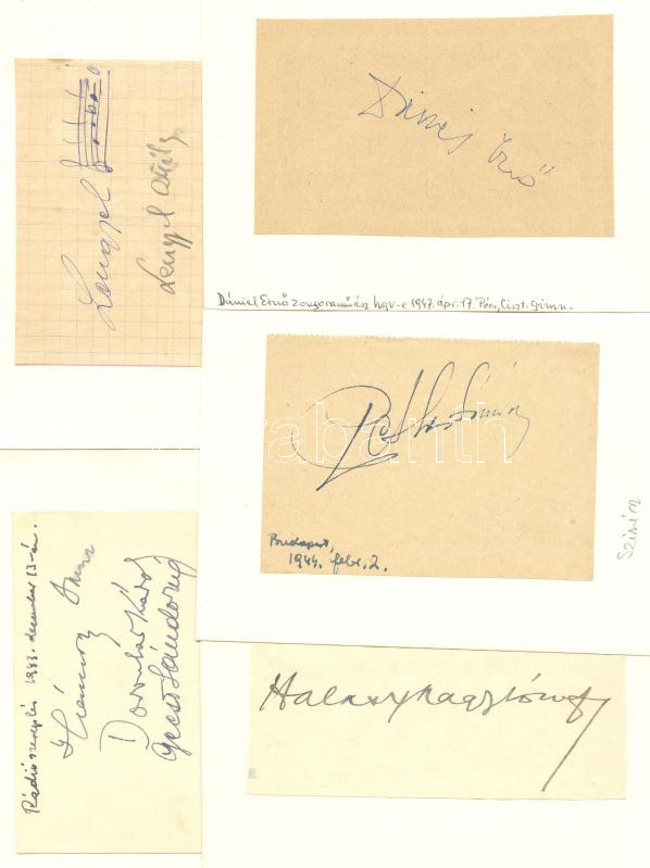 AláÃrások, autogramok gyűjteménye, elsÅ‘sorban zenészek: Assen St. Dimitroff, Lengyel Attila, Dániel ErnÅ‘ zongoraművész, Petes Sándor szÃnművész, Halasy Nagy József, Koltay-Kastner JenÅ‘, Bárány István úszó, régi rádiósok, kb 15 ember, összesen 10 kártyán