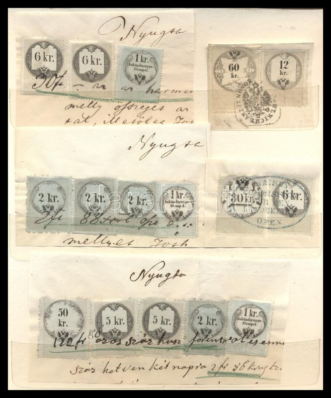 Beschreibung: 5 db szép okmánybélyeges kivágás, közte 3 okmánybélyeg és hirdetménybélyeg vegyes felhasználás