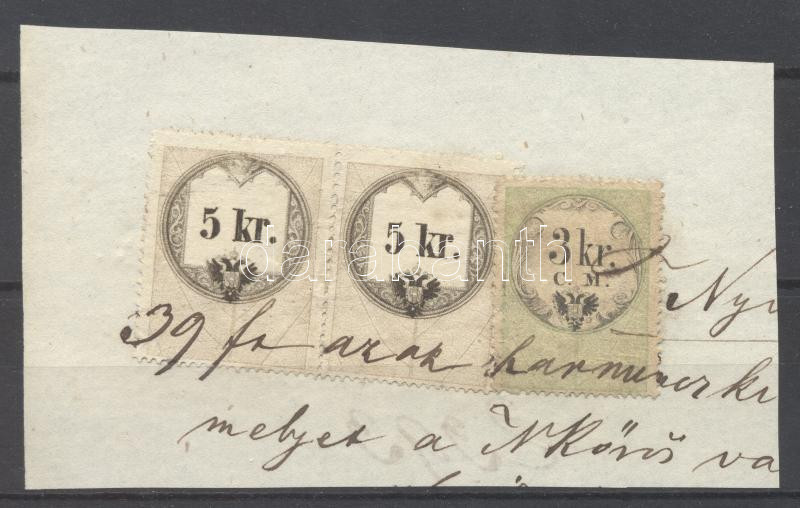 Kivágás 3kr C.M. + 2x 5kr okmánybélyegekkel https://www.darabanth.com/de/174-Fernauktion/174.0/Andere-Sammelgebiete/Stempelmarken~2200013/Kivagas-3kr-CM-plus-2x-5kr-okmanybelyegekkel~II596230
