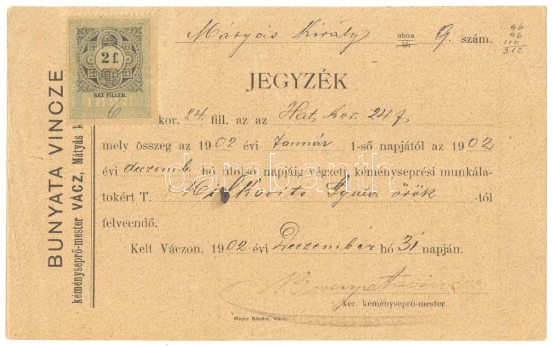 1902 Vác Bunyata Vince kéményseprő számla https://www.darabanth.com/de/174-Fernauktion/174.0/Andere-Sammelgebiete/Werbungen~2200025/1902-Vac-Bunyata-Vince-kemenysepro-szamla~II585350
