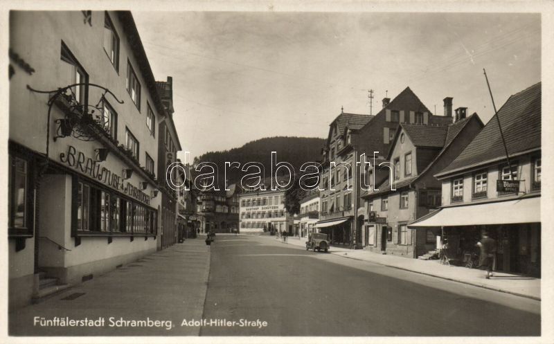 Schramberg Adolf Hitler street with Braustube Schraivogel, Restaurant ... https://www.darabanth.com/de/174-Fernauktion/174.0/Ansichtskarten/Deutschland~2200069/Schramberg-Adolf-Hitler-street-with-Braustube-Schraivogel-Restaurant-Schutzer-the-shops-of-Hugo-H~II402633