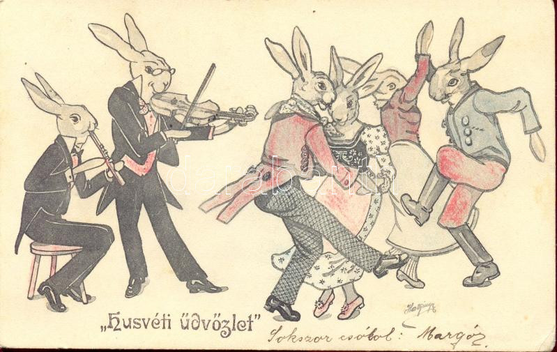 Easter dancing rabbits, artist signed (EK) https://www.darabanth.com/de/174-Fernauktion/174.0/Ansichtskarten/GruC39Fkarte~2200123/Easter-dancing-rabbits-artist-signed-EK~II596436