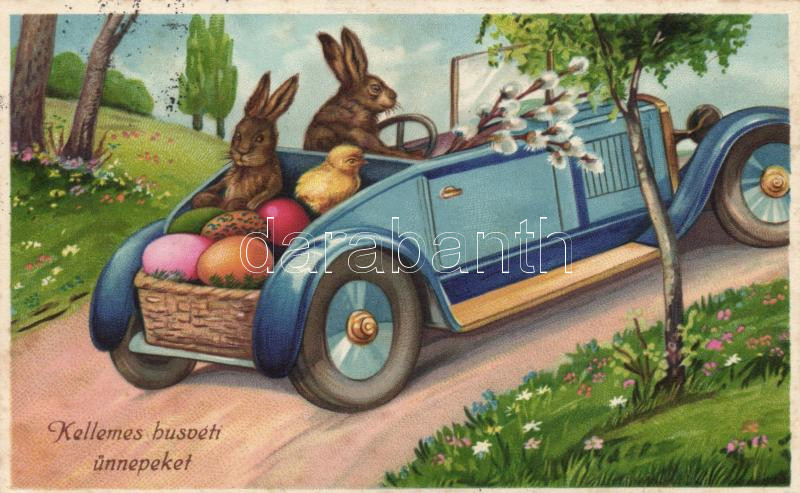 Beschreibung: Easter, rabbit, automobile, litho (Rb)