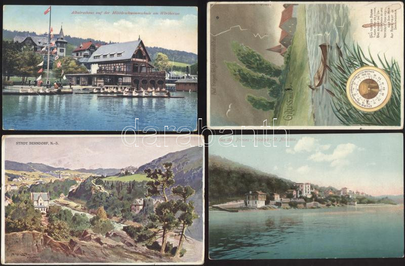16 db háború előtti, egy kivételével használatlan külföldi városképes lap, köztük egy, a művész Fritz Lach szignójával ellátott, valamint egy Divald Károly lap