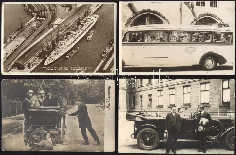 Beschreibung: 41 db régi, főleg háború előtti közlekedési tematikájú képeslap (automobil, hajó, repülő, vasút, fiáker, busz, bicikli), közte több fénykép