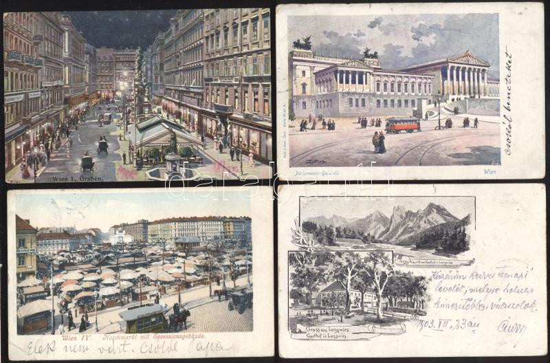 46 db háború előtti külföldi városképes lap (44 osztrák, egy cseh és egy olasz), bennük egy 1898-as és 1899-es lap, valamint több szignóval ellátott (J. Löwy, M.W.) lap