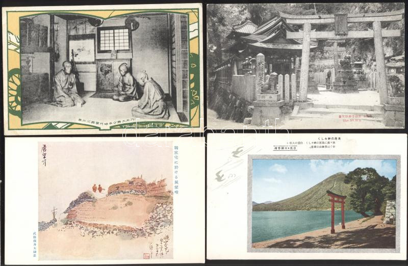 54 db régi japán, egy kivételével használatlan, vegyes tematikájú, főleg városképes és vallási témájú, és természetet ábrázoló képeslap, benne a híres Ashio rézbányáról is egy lap
