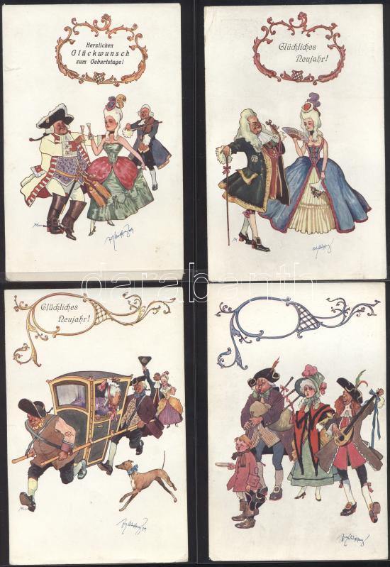 Beschreibung: 8 db művészlap, katonai humor és újévi, születésnapi üdvözlés téma, pinx. Schönpflug (non pc)