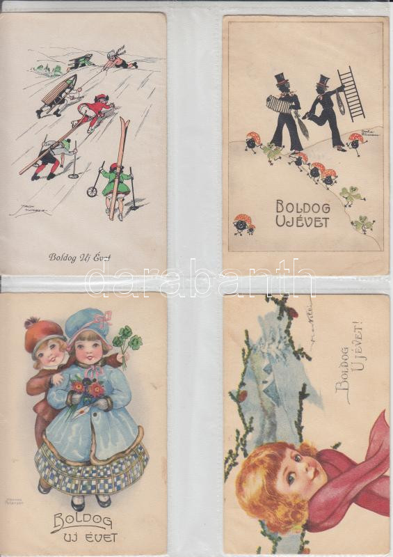 Beschreibung: Újévi képeslapok, 16 db háború előtti képeslap jobbakkal