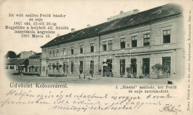 Kolozsvár Hotel Biasini, Petőfi memorial https://www.darabanth.com/de/174-Fernauktion/174.0/Ansichtskarten/Siebenburgen~2200042/Kolozsvar-Hotel-Biasini-Petofi-memorial~II598854