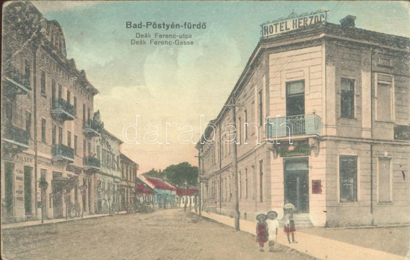 Pöstyén Deák street, Hotel Herzog (EB) https://www.darabanth.com/de/174-Fernauktion/174.0/Ansichtskarten/Slowakei~100006/Postyen-Deak-street-Hotel-Herzog-EB~II599550