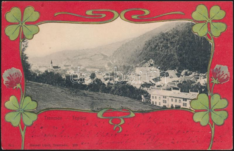 Trencsénteplic, Art Nouveau clover litho https://www.darabanth.com/de/174-Fernauktion/174.0/Ansichtskarten/Slowakei~100006/Trencsenteplic-Art-Nouveau-clover-litho~II599689