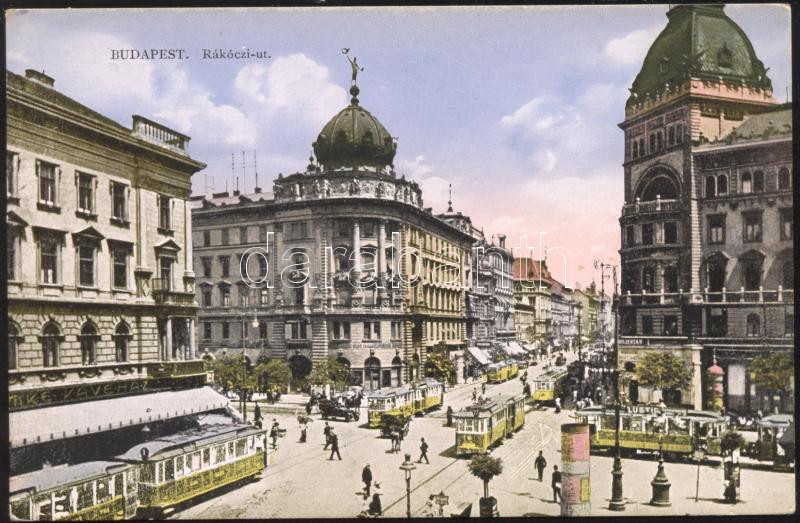 Beschreibung: Budapest VII. Rákóczi út, EMKE Kávéház, Takarékpénztár, villamosok
