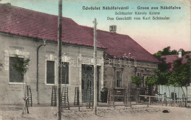 Nákófalva the shop of Károly Schüszler https://www.darabanth.com/de/174-Fernauktion/174.0/Ansichtskarten/Vojvodina~100009/Nakofalva-the-shop-of-Karoly-Schuszler~II599936
