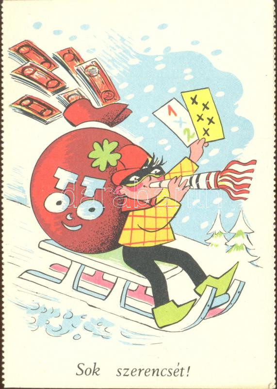 Beschreibung: Totó-lottó reklám üdvözlőlapon, s: Macskássy Gyula / Hungarian lottery advertisement