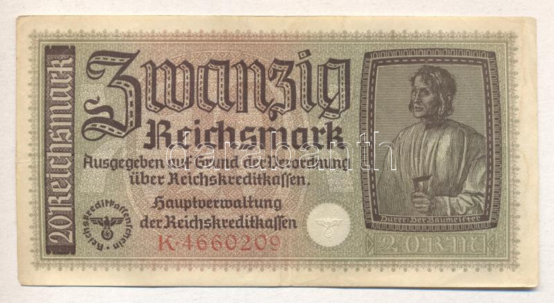 German Third Reich 1940-45. 20 R... https://www.darabanth.com/de/174-Fernauktion/174.0/Numismatik/Auslandische-Banknoten~2200144/Nemet-3-Birodalom-1940-45-20M-TII--3Cbr3EGerman-Third-Reich-1940-45-20-Reichsmark-CVF~II601476