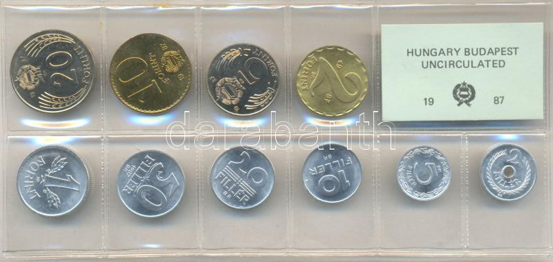 1987. 2f-20Ft 10db klf érmés forgalmi sor fóliatokban T:1 https://www.darabanth.com/de/174-Fernauktion/174.0/Numismatik/Ungarische-Munzen~2200141/1987-2f-20Ft-10db-klf-ermes-forgalmi-sor-foliatokban-T1-3Cbr3E~II595454