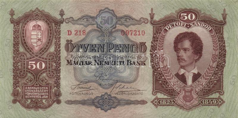 1932. 50P (2x) egymásutáni sorszámmal T:I https://www.darabanth.com/de/174-Fernauktion/174.0/Numismatik/Ungarische-banknoten~2200140/1932-50P-2x-egymasutani-sorszammal-TI~II386587