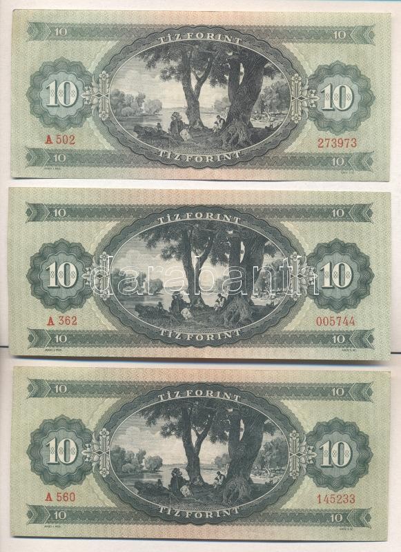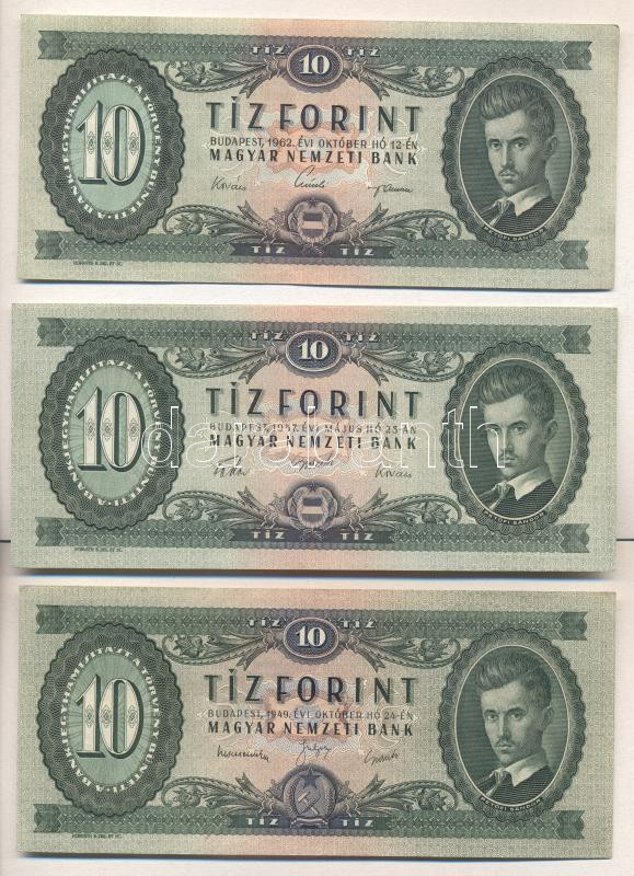 1949. 10Ft + 1957. 10Ft + 1962. 10Ft T:II https://www.darabanth.com/de/174-Fernauktion/174.0/Numismatik/Ungarische-banknoten~2200140/1949-10Ft-plus-1957-10Ft-plus-1962-10Ft-TII~II597674