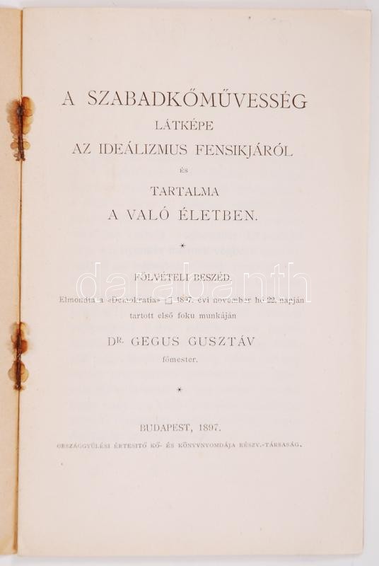 Demokratia-Páholy Könyvtára: Dr. Gegus Gusztáv: A szabadkőművesség látképe az ideálizmus fensikjáról és tartalma a való életben. Bp., 1897, A páholy sajátja