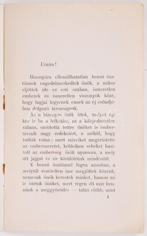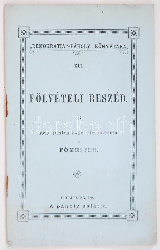 Beschreibung: Demokratia-Páholy Könyvtára: Fölvételi beszéd. 1899. junius 5-én elmondotta a Főmester. Bp., 1899, A páholy sajátja