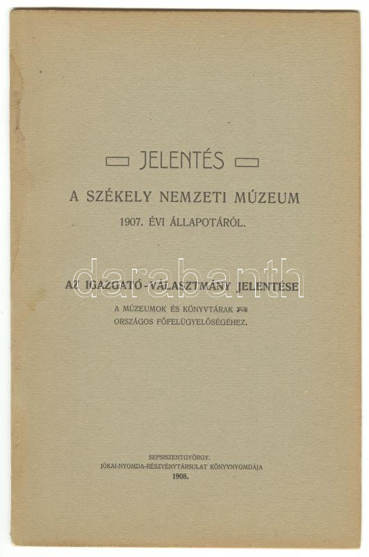 Jelentés a Székely Nemzeti Múzeum 1907. évi állapotáról. Sepsiszentgyö... https://www.darabanth.com/de/175-Fernauktion/175.0/Andere-Sammelgebiete/Bucher-Geschichte~1000031/Jelentes-a-Szekely-Nemzeti-Muzeum-1907-evi-allapotarol-Sepsiszentgyorgy-1908-25p~II603912