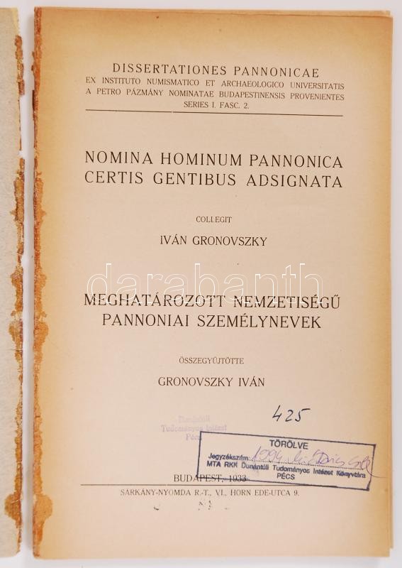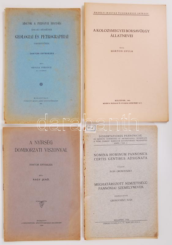 Beschreibung: Márton Gyula: A kolozsmegyei Borsavölgy állatnevei; Gronovszky Iván: Meghatározott nemzetiségű pannoniai személynevek, és még 2db doktori értekezés