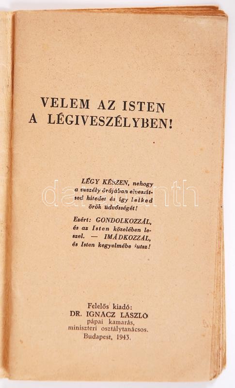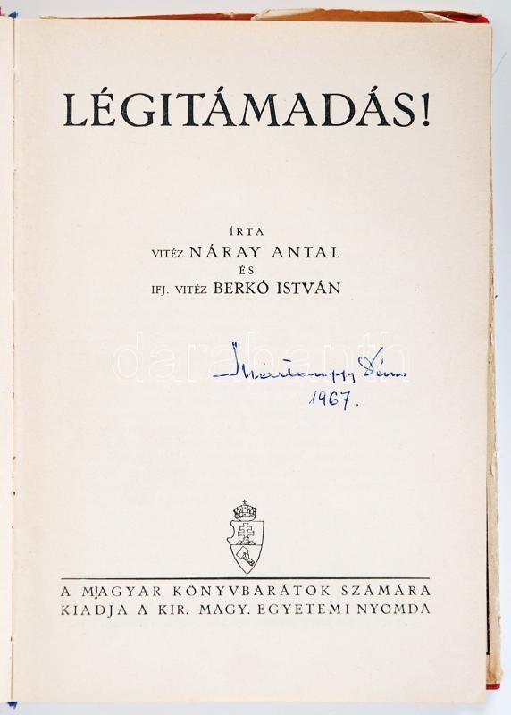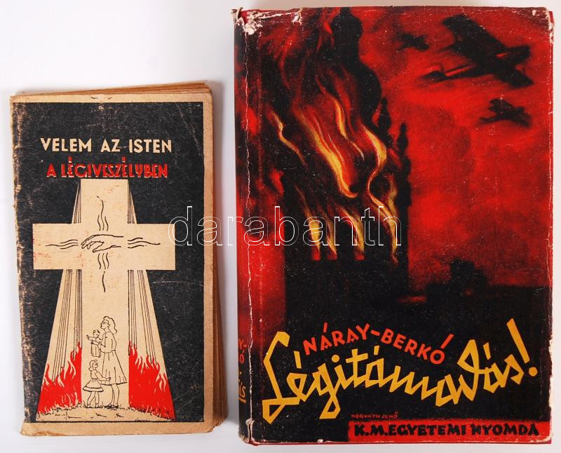 Vitéz Náray Antal - Ifj. Vitéz Berkó István: Légitámadás! Bp., [1941] Kir. Magy. Egyetemi Nyomda. Egészvászon kötésben, védőborítóval, fotókkal és ábrákkal gazdagon illusztrált; mellékelve: Velem az Isten a légiveszélyben, propagandafüzet