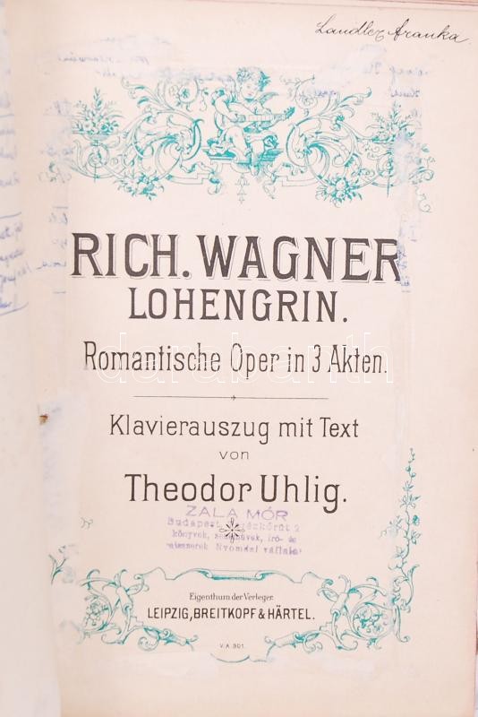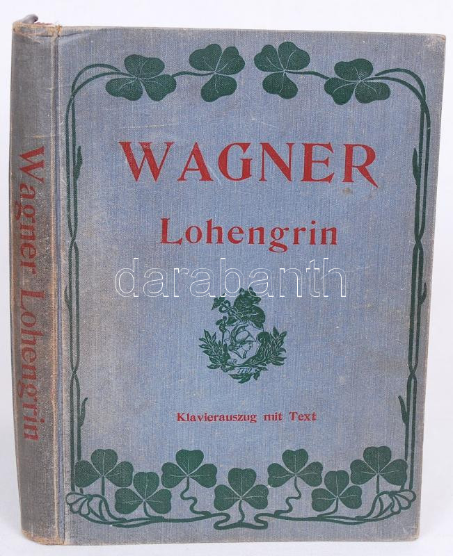 Richard Wagner: Lohengrin. Romantische Oper in 3 Akten. Klavierauszug mit Text v. Th. Uhlig. Leipzig, o.J., Breitkopf & Härtel. Kivonatok zongorára és énekre, kiadói festett szecessziós egészvászon kötésben (az előzék és a címlap kijár, sérült) /