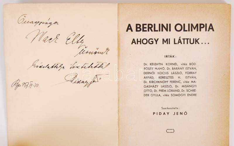 Piday Jenő: A Berlini Olimpia, ahogy mi láttuk. Dedikált! Kellner Jenő... https://www.darabanth.com/de/175-Fernauktion/175.0/Andere-Sammelgebiete/Bucher-Sonstige-Raritaten~1000042/Piday-Jeno-A-Berlini-Olimpia-ahogy-mi-lattuk-Dedikalt-Kellner-Jeno-1937~II609063