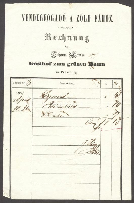 1847 Pozsony Zöld fa fogadó számla / Pressburg inn invoice https://www.darabanth.com/de/175-Fernauktion/175.0/Andere-Sammelgebiete/Dokument~1000018/1847-Pozsony-Zold-fa-fogado-szamla-Pressburg-inn-invoice~II605820