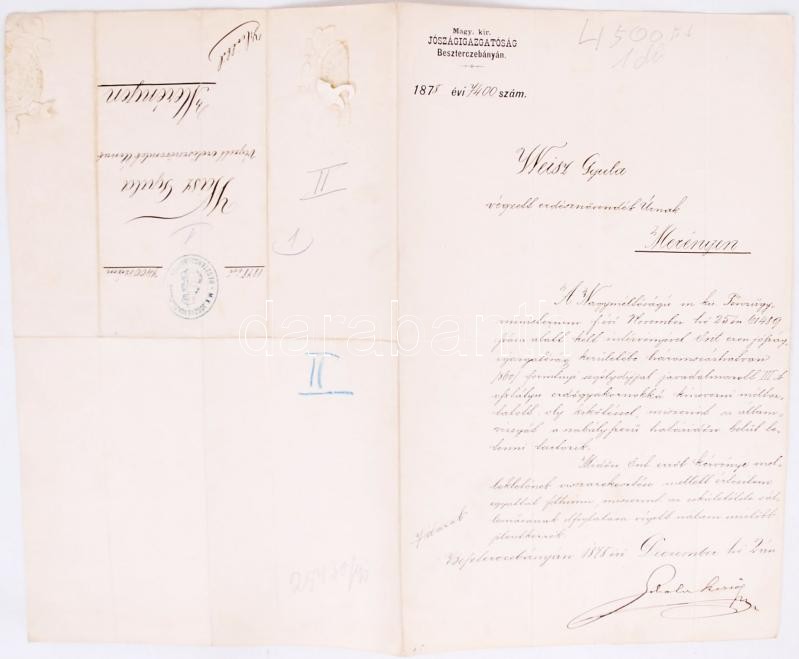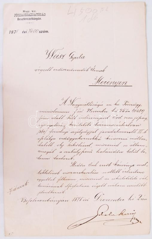 1878 M. kir. Jószágigazgatóság Besztercebánya erdőgyakornoki kinevezés... https://www.darabanth.com/de/175-Fernauktion/175.0/Andere-Sammelgebiete/Dokument~1000018/1878-M-kir-Joszagigazgatosag-Besztercebanya-erdogyakornoki-kinevezes-szarazpecsettel~II609495
